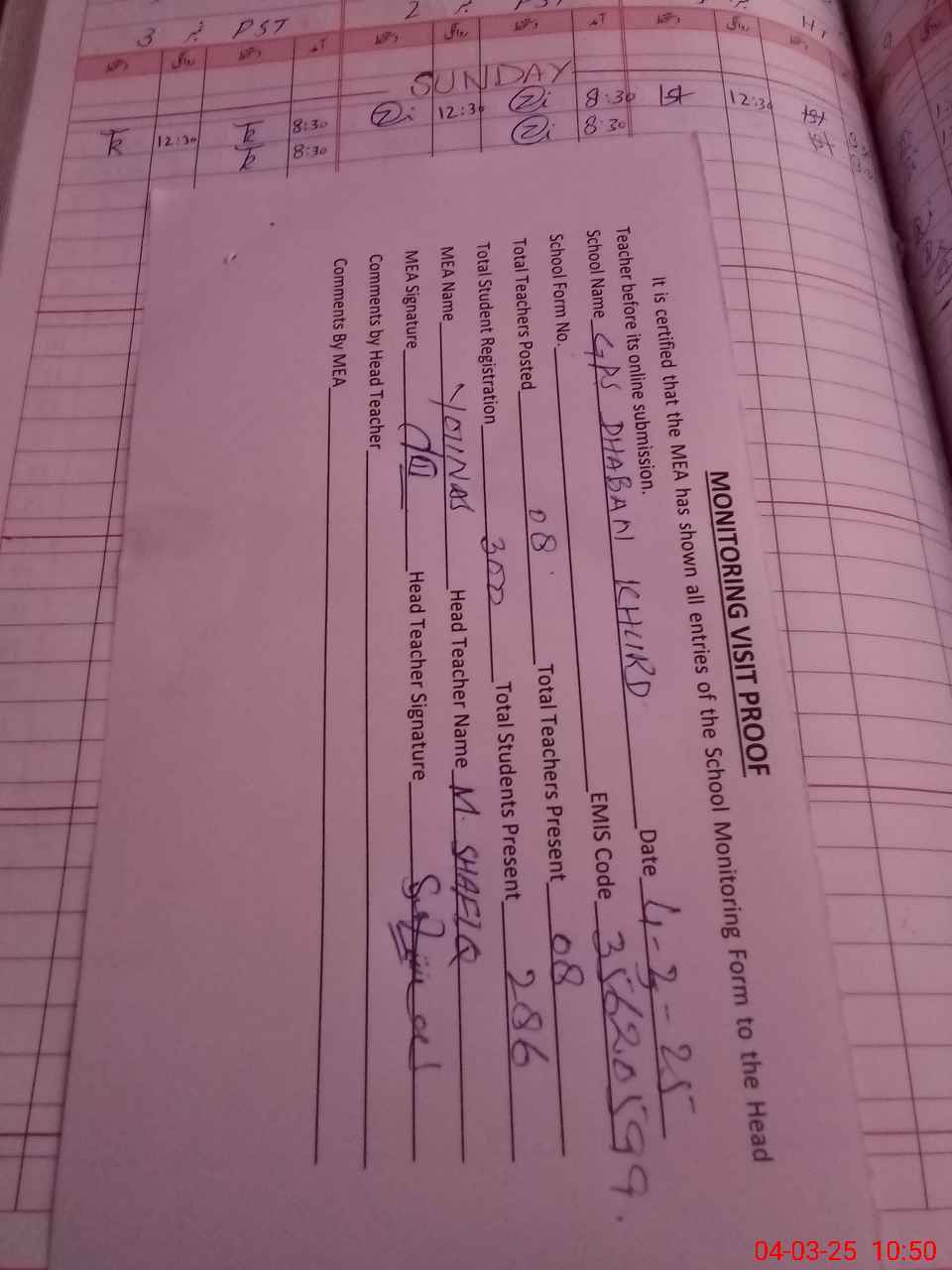 | Attendance Register | Head Teacher | MEA with School | Visit Proof |
