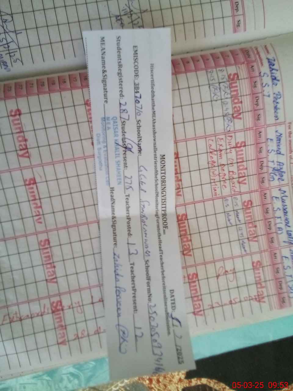 | Attendance Register | Head Teacher | MEA with School | Visit Proof |
