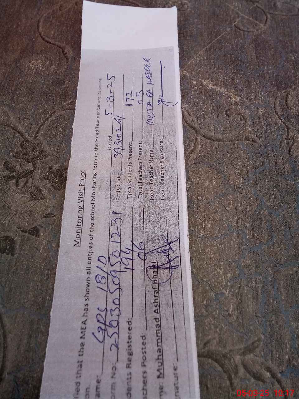 | Name: MU**** HA**** Designation: (School Headmaster's/Headmistress's) PST Phone/Cell Number: 03**** |