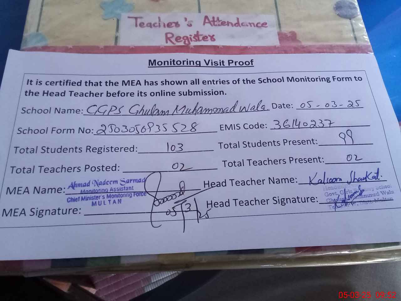| EMIS Code: 36140237 | Name of School: GGPS GHULAM MOHAMMAD WALA | |||