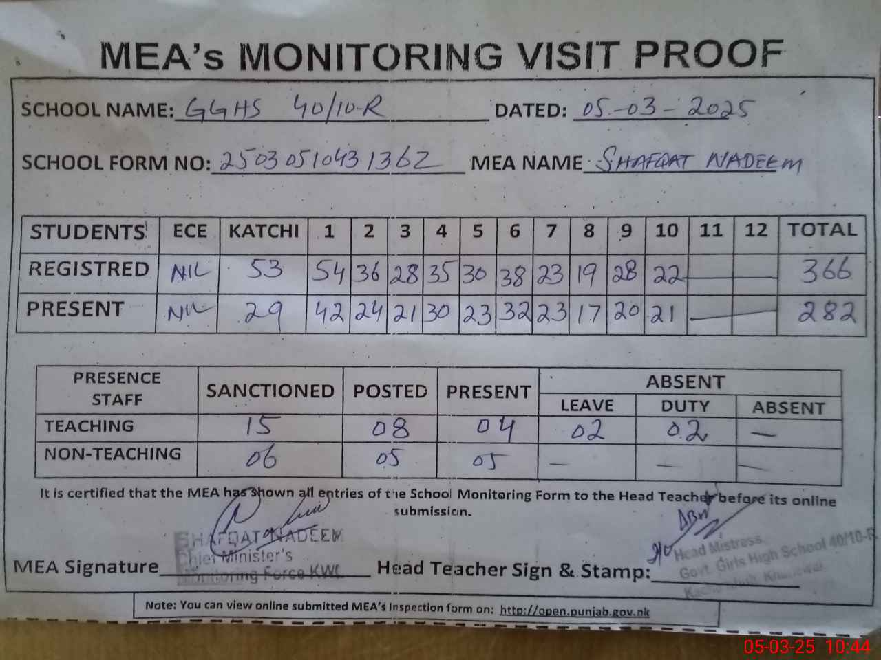 | EMIS Code: 36420118 | Name of School: GGHS 40/10-R, KACHA KHUH | |||
