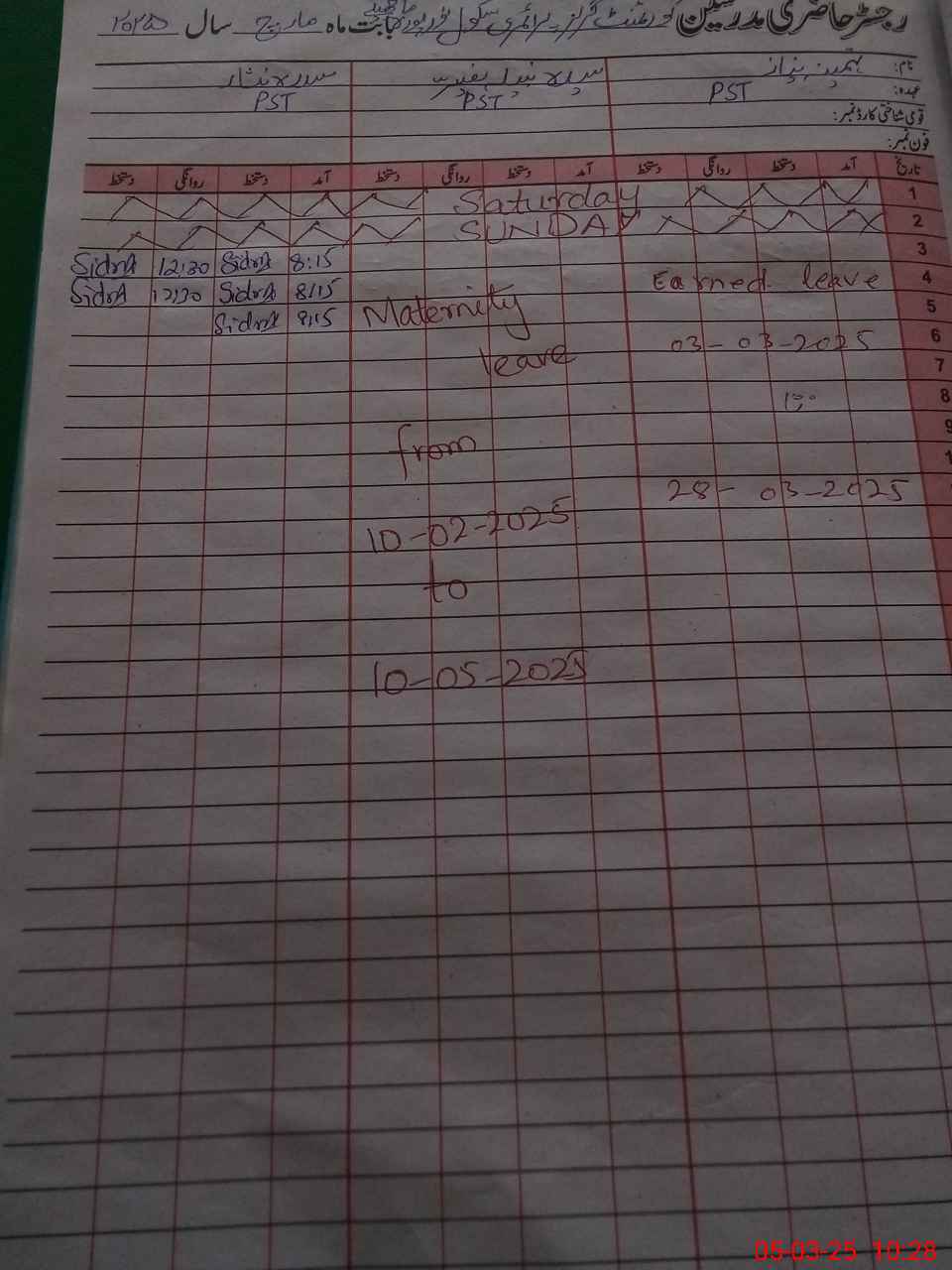 | 35**** | Sy**** Na**** Na**** | PST | Regular | 19 | 0 | 0 | 19 | 0 | 0 | 0 | 0 | 0 | Maternity |