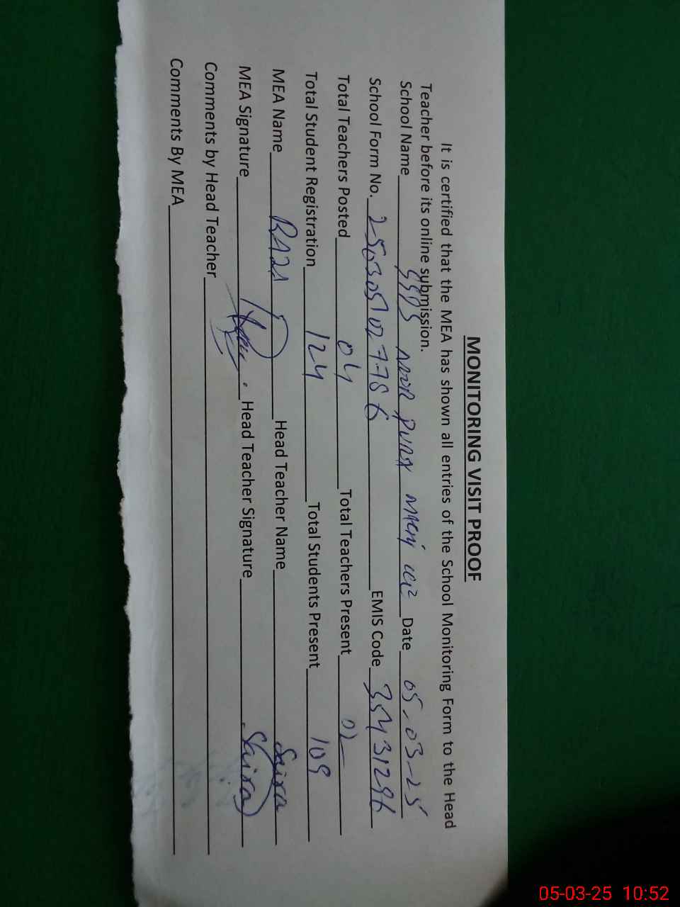 | Attendance Register | Head Teacher | MEA with School | Visit Proof |