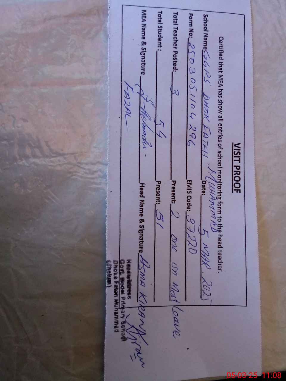 | Attendance Register | Head Teacher | MEA with School | Visit Proof |