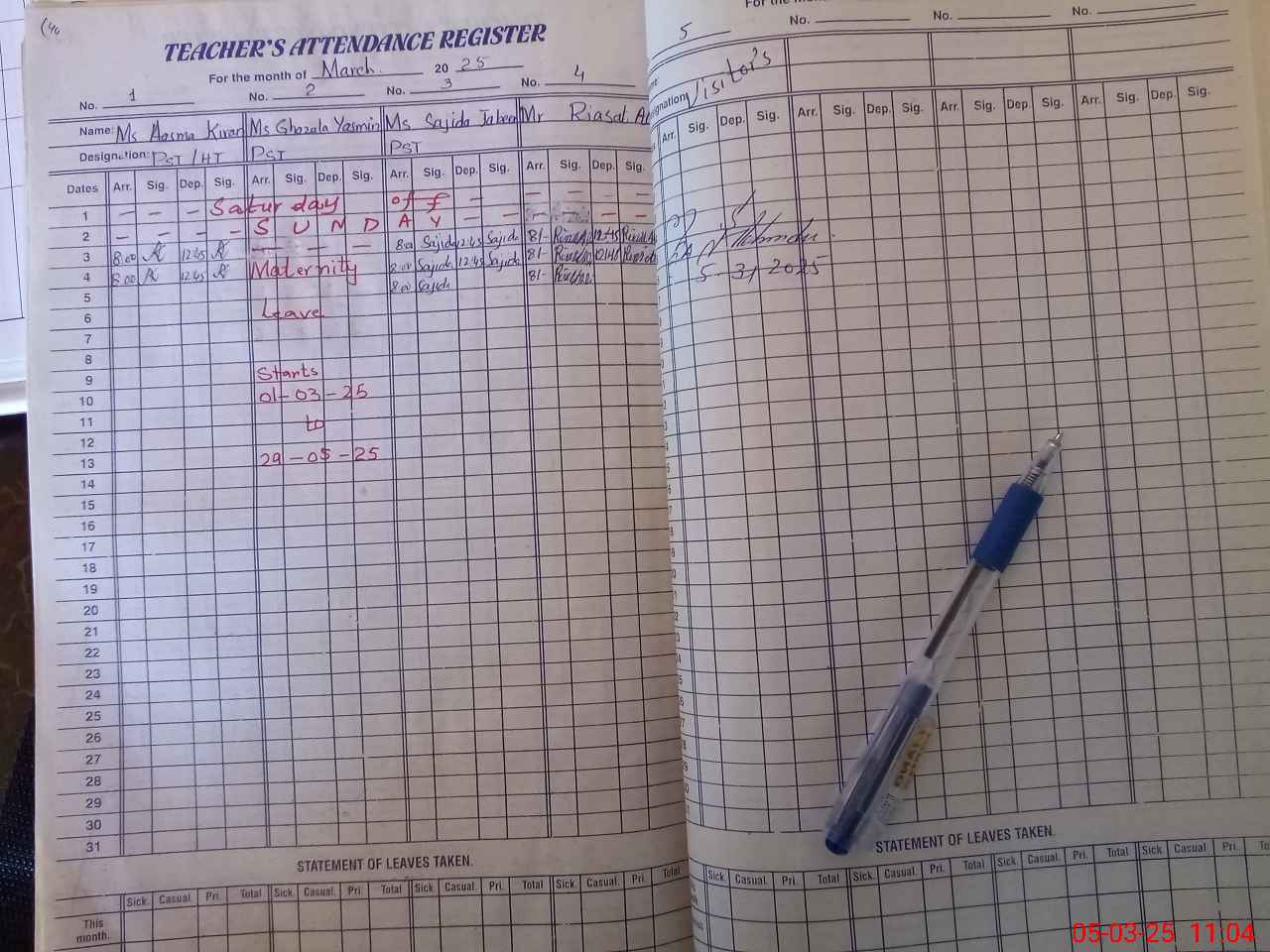 | 37**** | Gh**** Ya**** | PST | Regular | 0 | 0 | 0 | 0 | 0 | 0 | 0 | 0 | 0 | Maternity |
