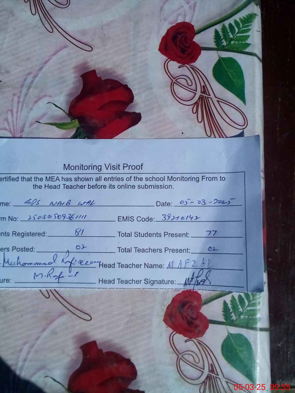 | Attendance Register | Head Teacher | MEA with School | Visit Proof |