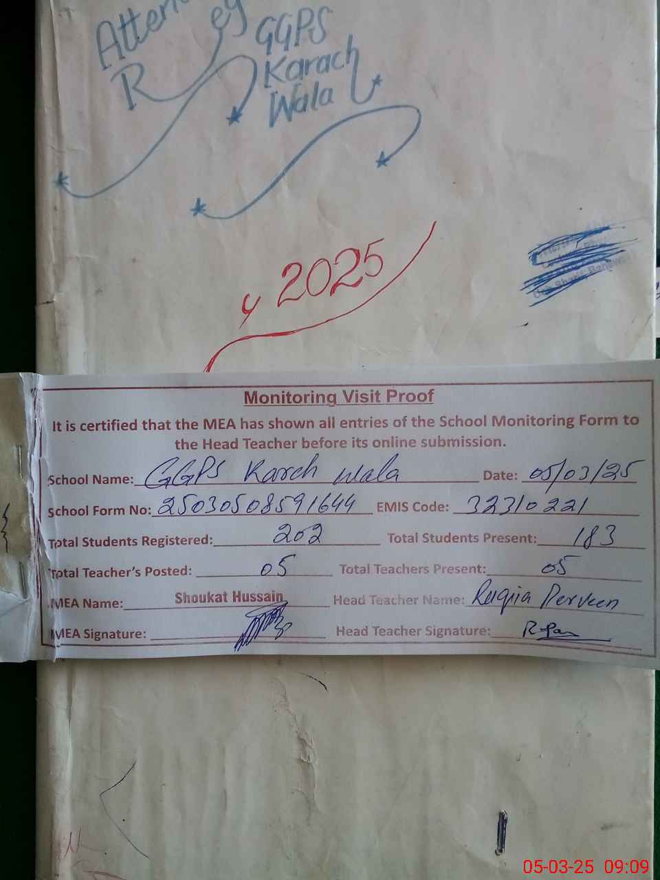 | Attendance Register | Head Teacher | MEA with School | Visit Proof |
