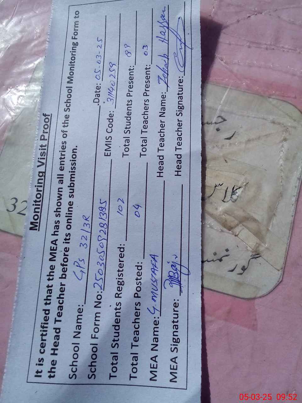 | Attendance Register | Head Teacher | MEA with School | Visit Proof |