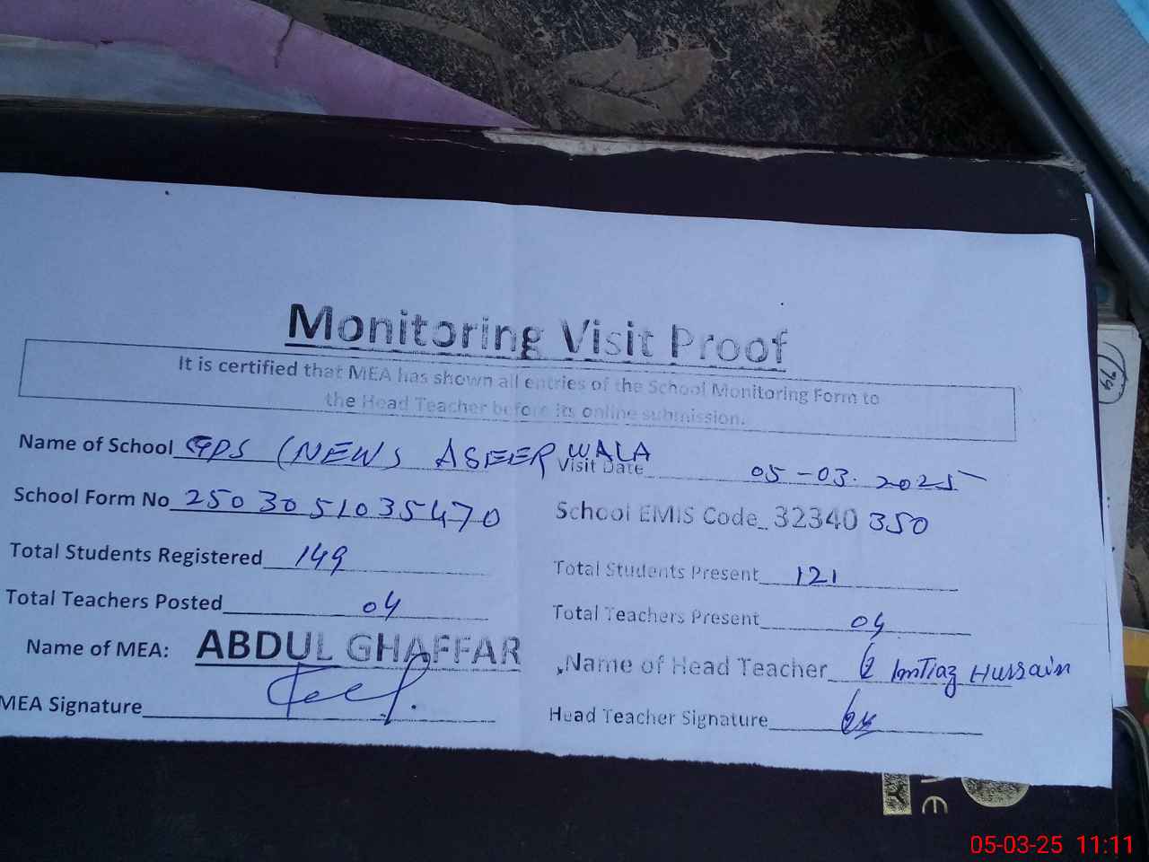 | EMIS Code: 32340350 | Name of School: GPS NEW ASIR WALA | |||
