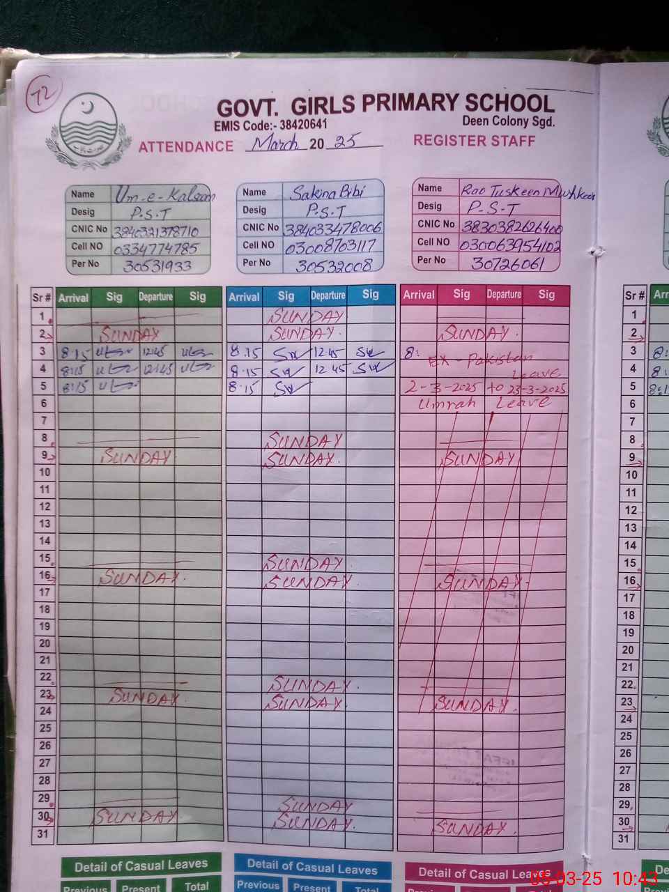 | CNIC | Full Name | Designation | R/C | Absence During Last Calender Month |