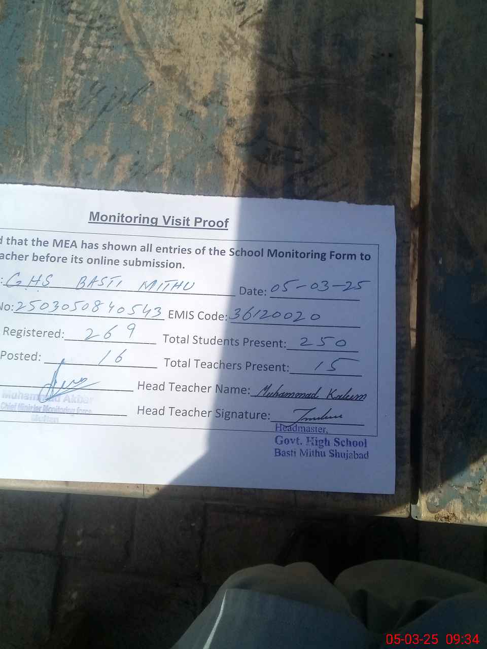 | Name: Mu**** As**** Ma**** Designation: (School Headmaster's/Headmistress's) H M Ops Phone/Cell Number: 03**** |