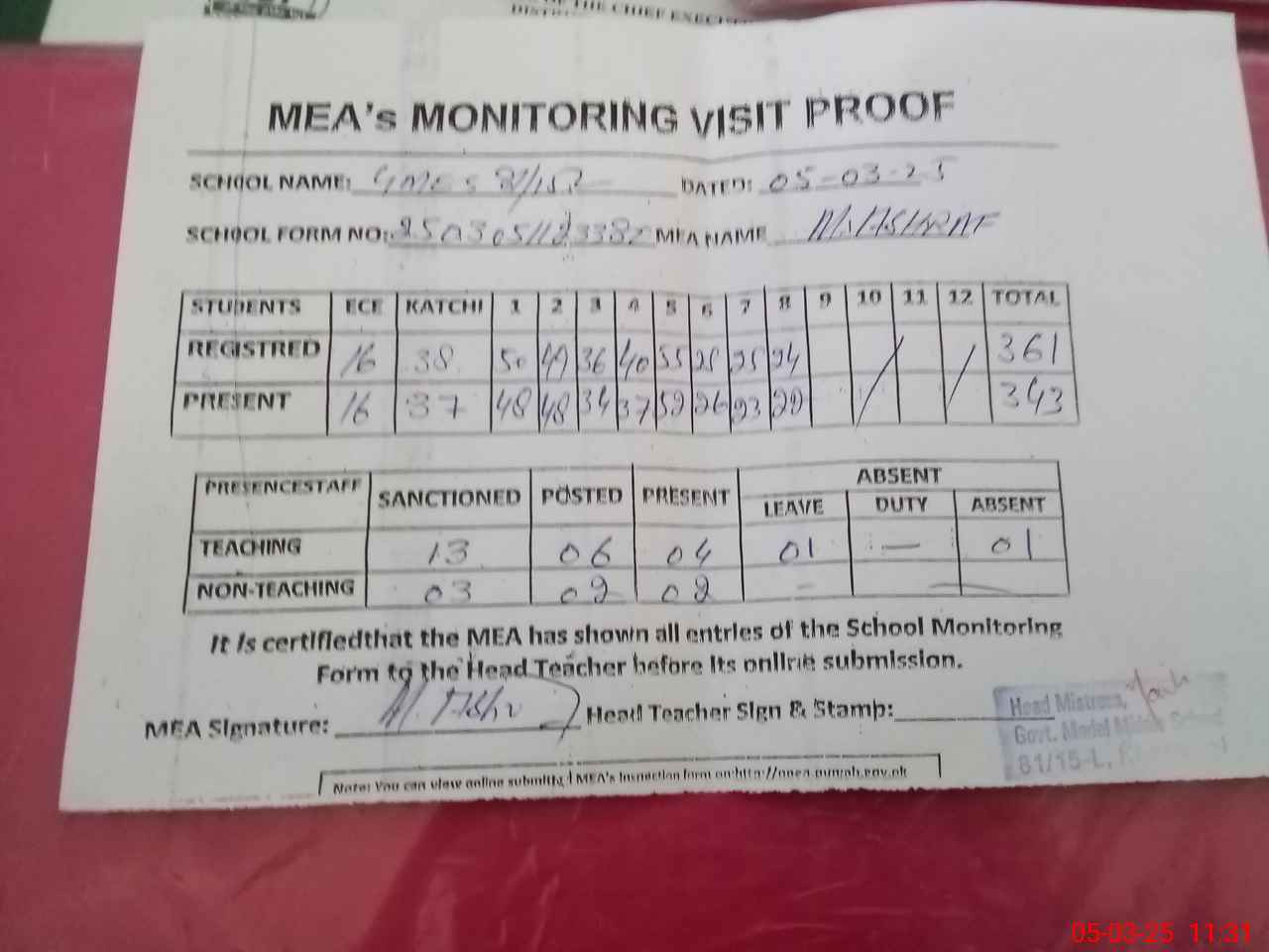 | Attendance Register | Head Teacher | MEA with School | Visit Proof |