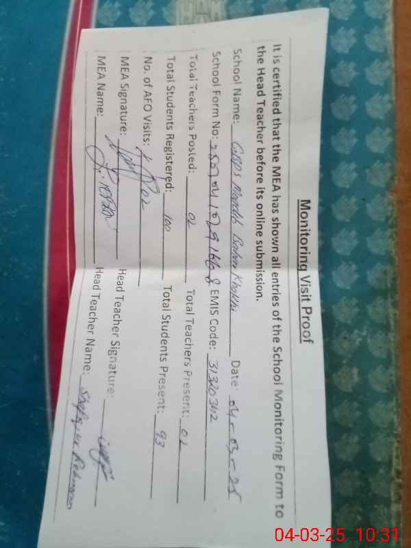 | EMIS Code: 31320342 | Name of School: GPS MOADIB BAHAR KHAKHI | |||