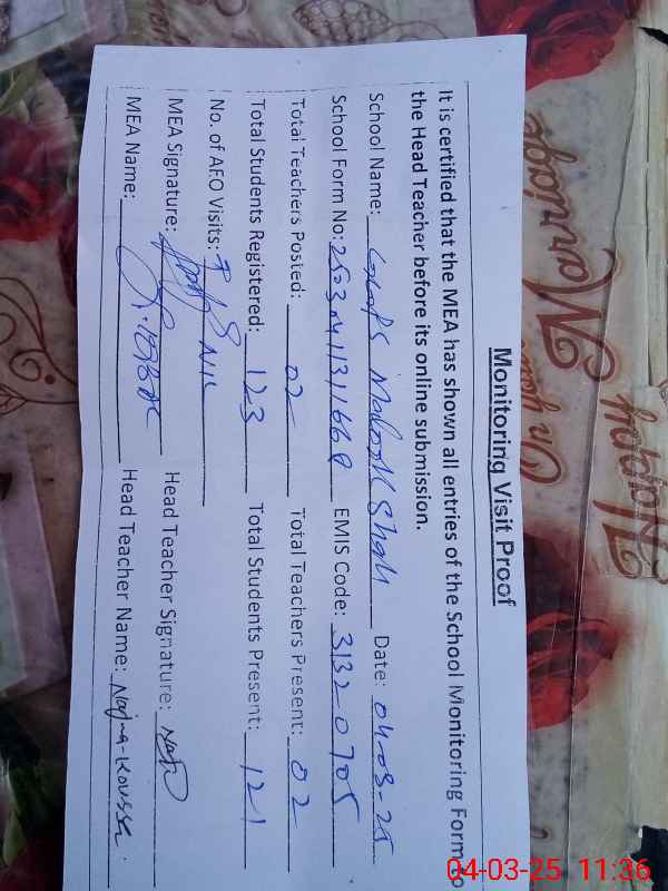 | EMIS Code: 31320705 | Name of School: GGPS MALOOK SHAH NO. 1 | |||