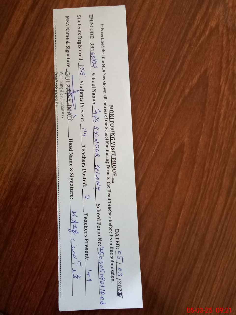 | Attendance Register | Head Teacher | MEA with School | Visit Proof |