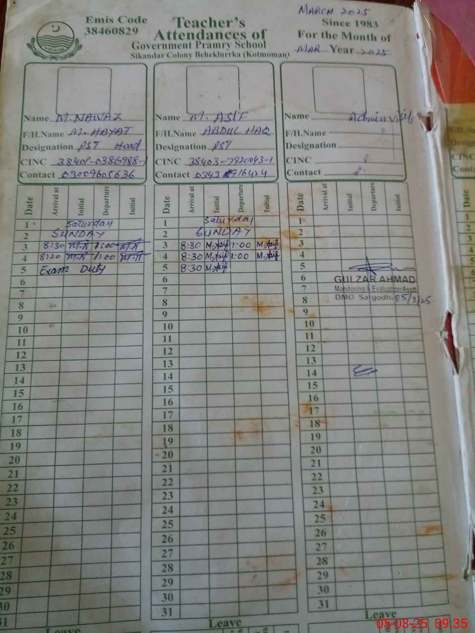 | Name: MU**** NA**** Designation: (School Headmaster's/Headmistress's) PST Phone/Cell Number: 03**** |