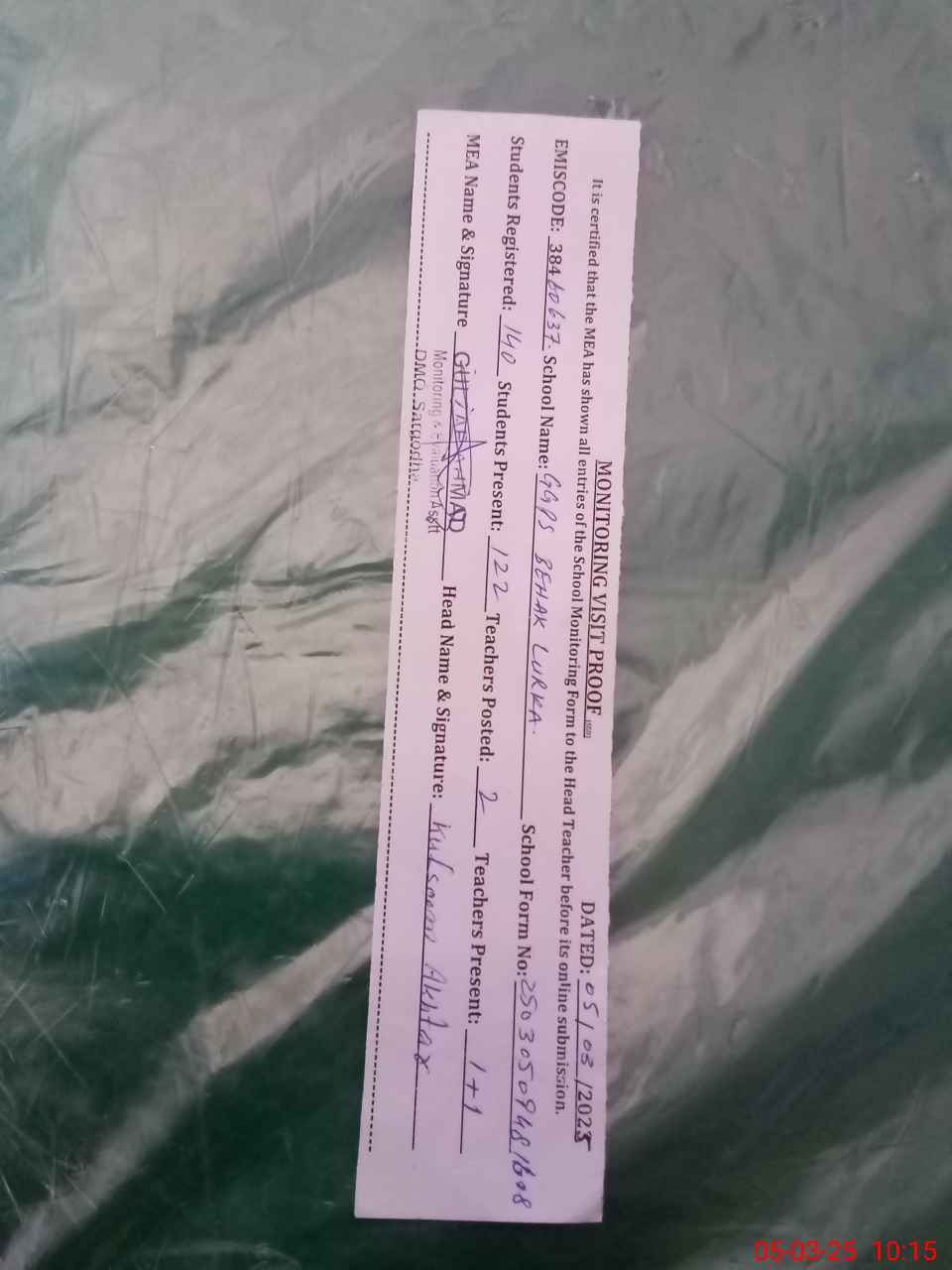 | Certified that this School was Inspected by the Undersigned MEA/DMO Today and the Information Stated Above is as Per Record. | |||||