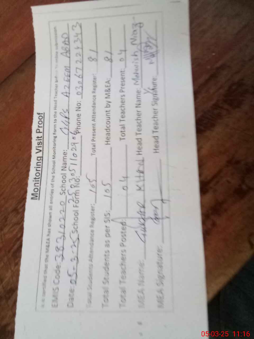 | Attendance Register | Head Teacher | MEA with School | Visit Proof |