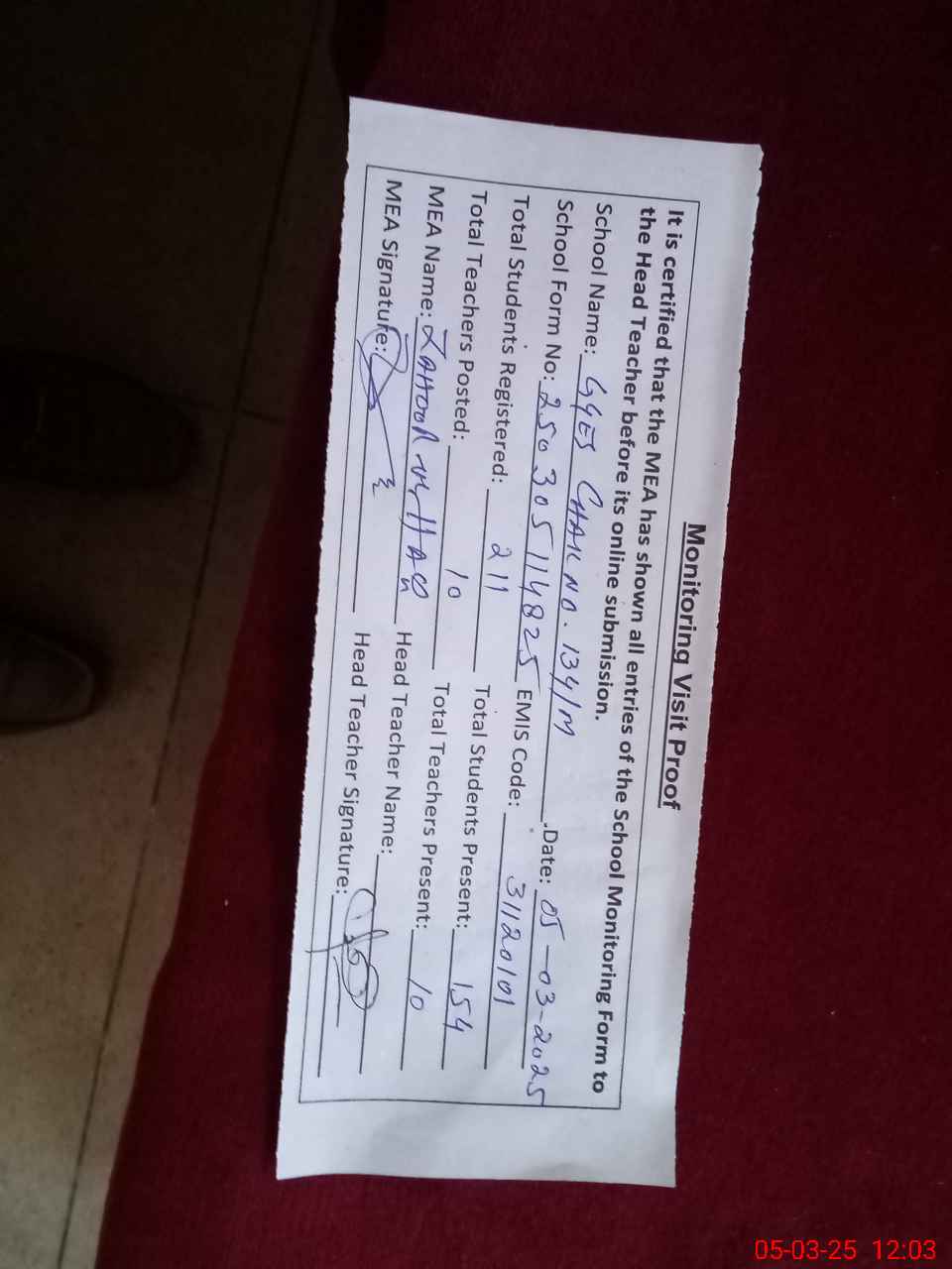 | EMIS Code: 31120101 | Name of School: GGES CHAK NO 134 MURAD | |||