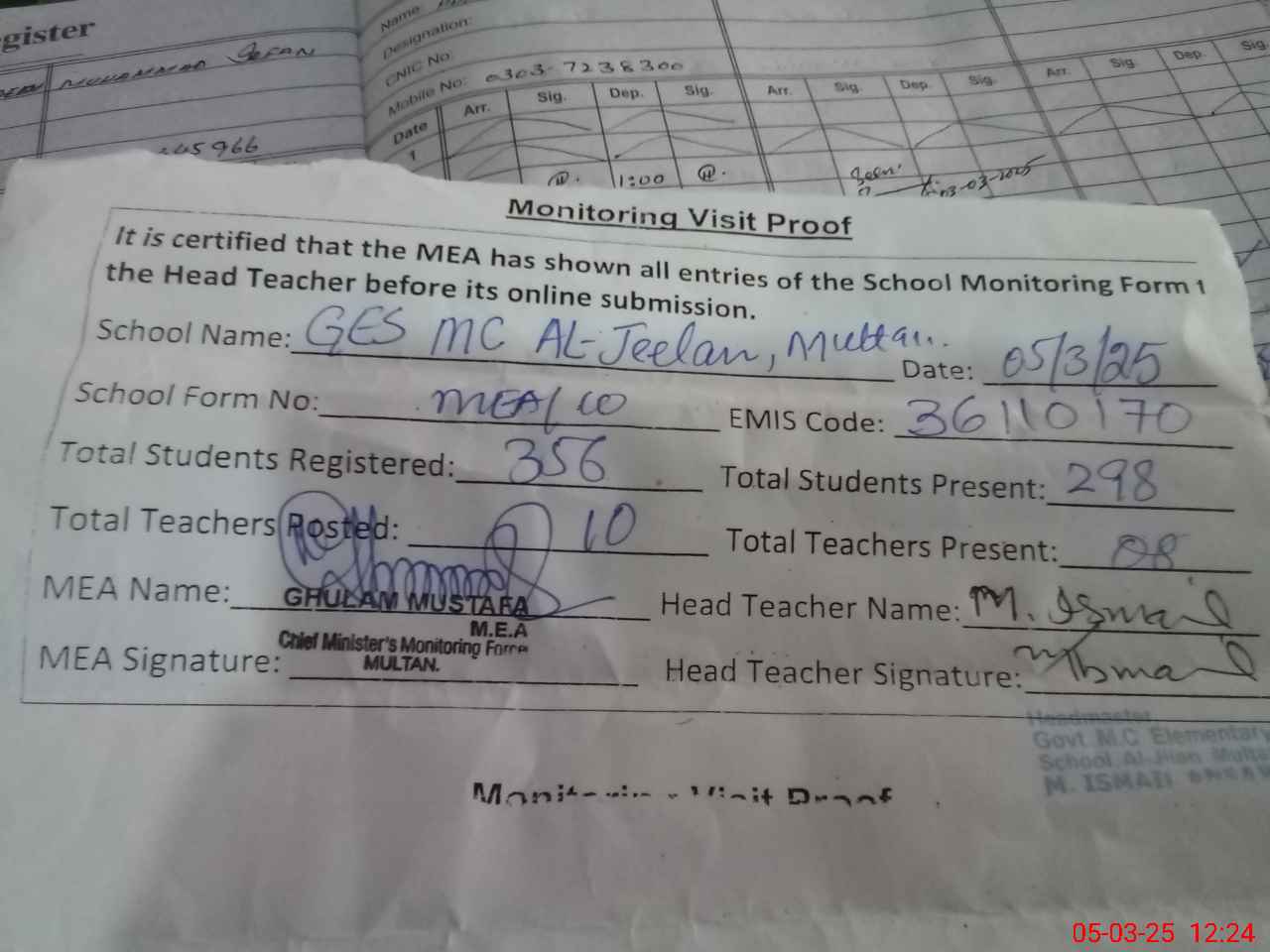 | Attendance Register | Head Teacher | MEA with School | Visit Proof |