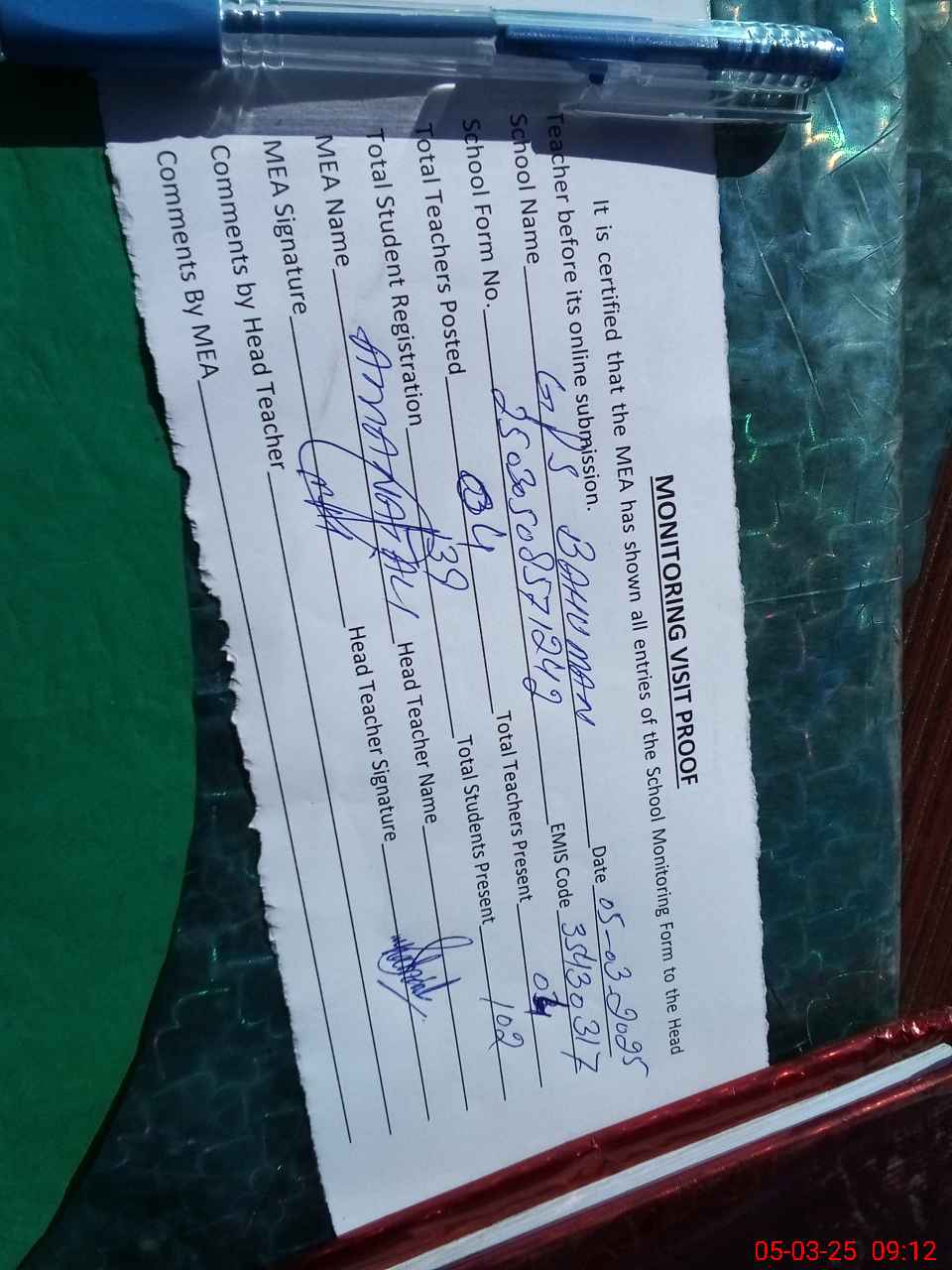 | Attendance Register | Head Teacher | MEA with School | Visit Proof |