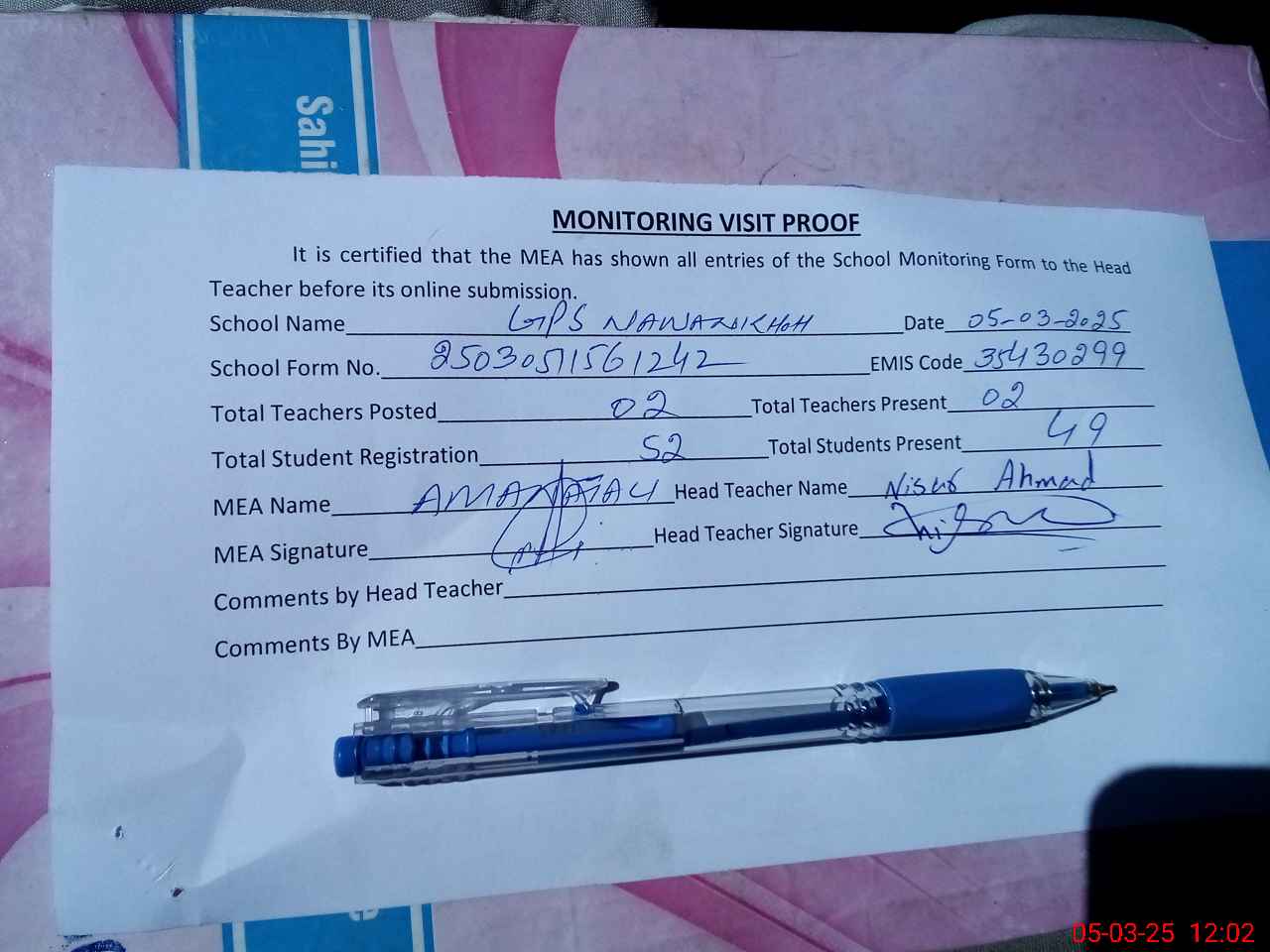 | Attendance Register | Head Teacher | MEA with School | Visit Proof |