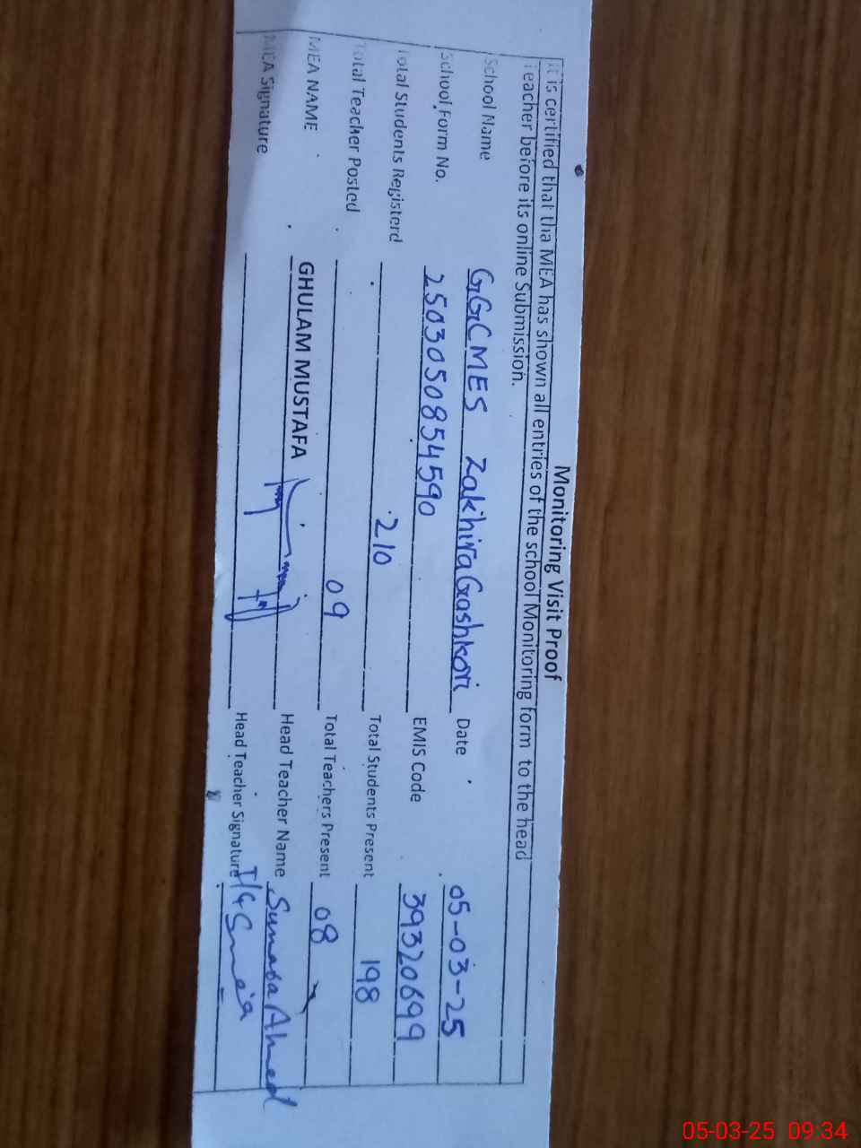 | Attendance Register | Head Teacher | MEA with School | Visit Proof |