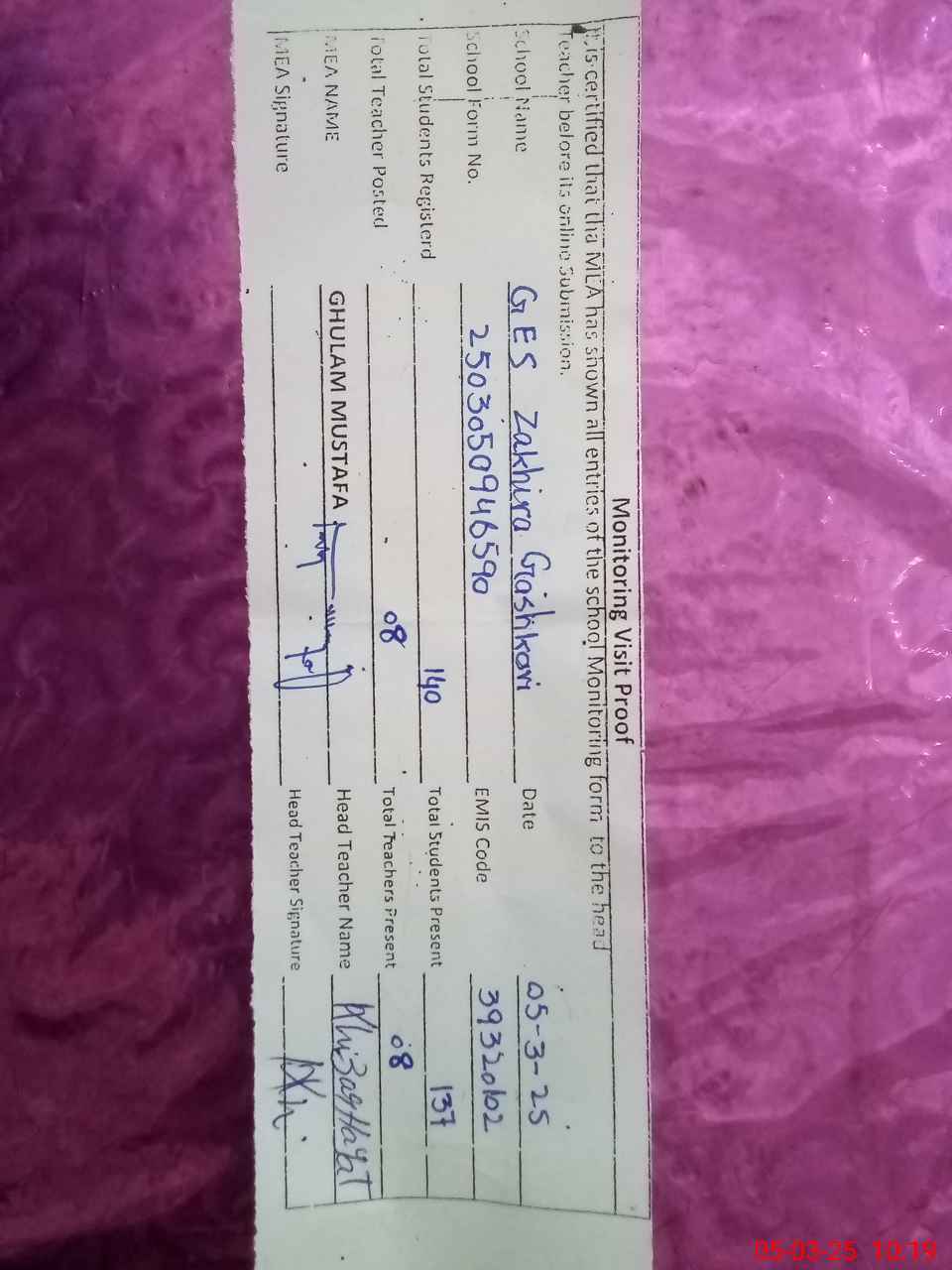 | Attendance Register | Head Teacher | MEA with School | Visit Proof |