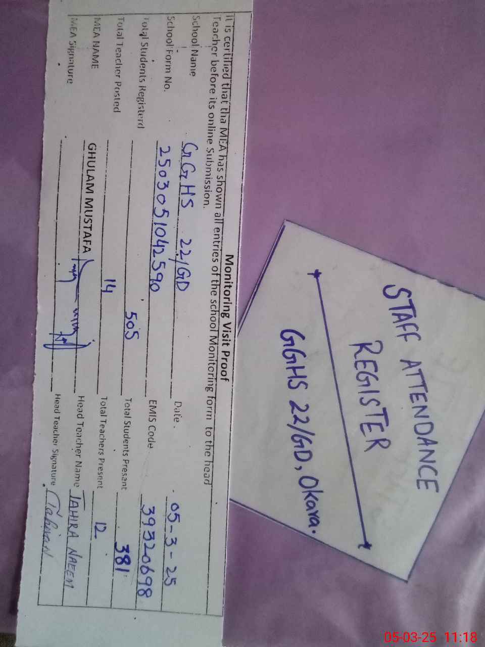 | Attendance Register | Head Teacher | MEA with School | Visit Proof |