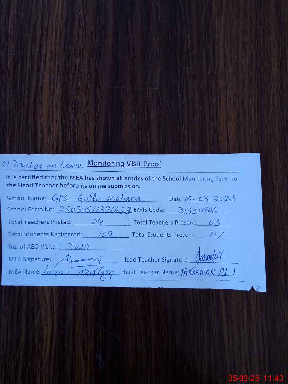 | EMIS Code: 31330906 | Name of School: GPS GULLU MOHANA | |||