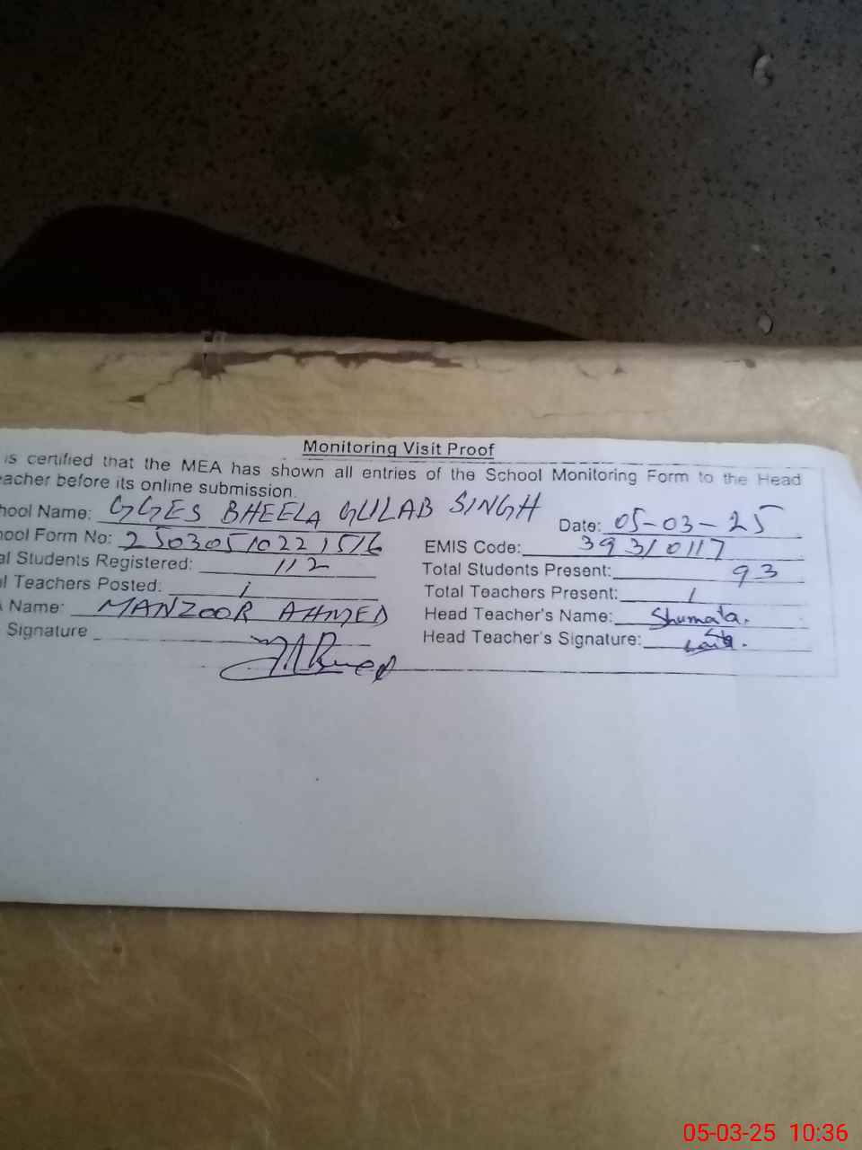 | Attendance Register | Head Teacher | MEA with School | Visit Proof |