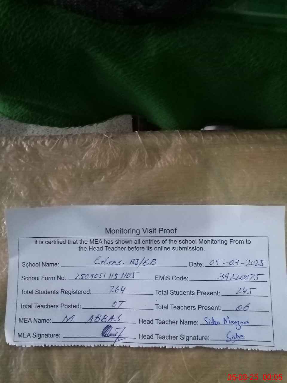 | Certified that this School was Inspected by the Undersigned MEA/DMO Today and the Information Stated Above is as Per Record. | |||||