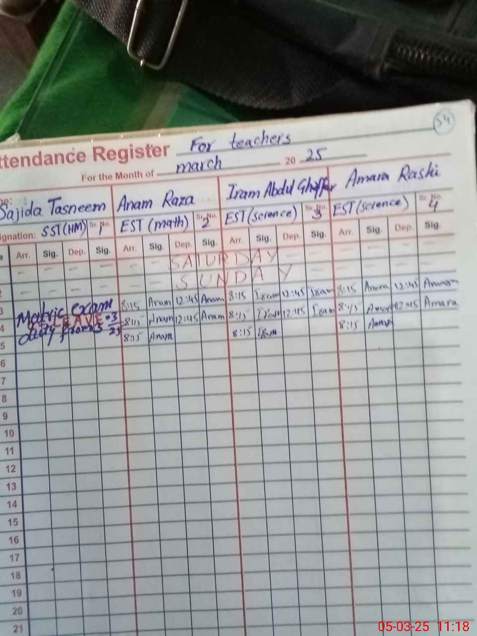 | 36**** | Sa**** Ta**** | Regular | 0 | 4 | 0 | 0 | 0 | 0 | 0 | 0 | 0 | Exam Duty | |