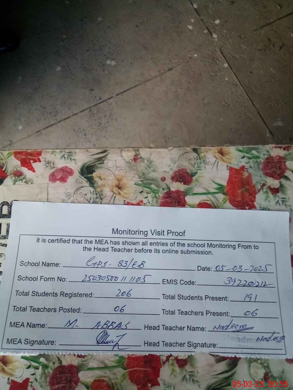 | Certified that this School was Inspected by the Undersigned MEA/DMO Today and the Information Stated Above is as Per Record. | |||||