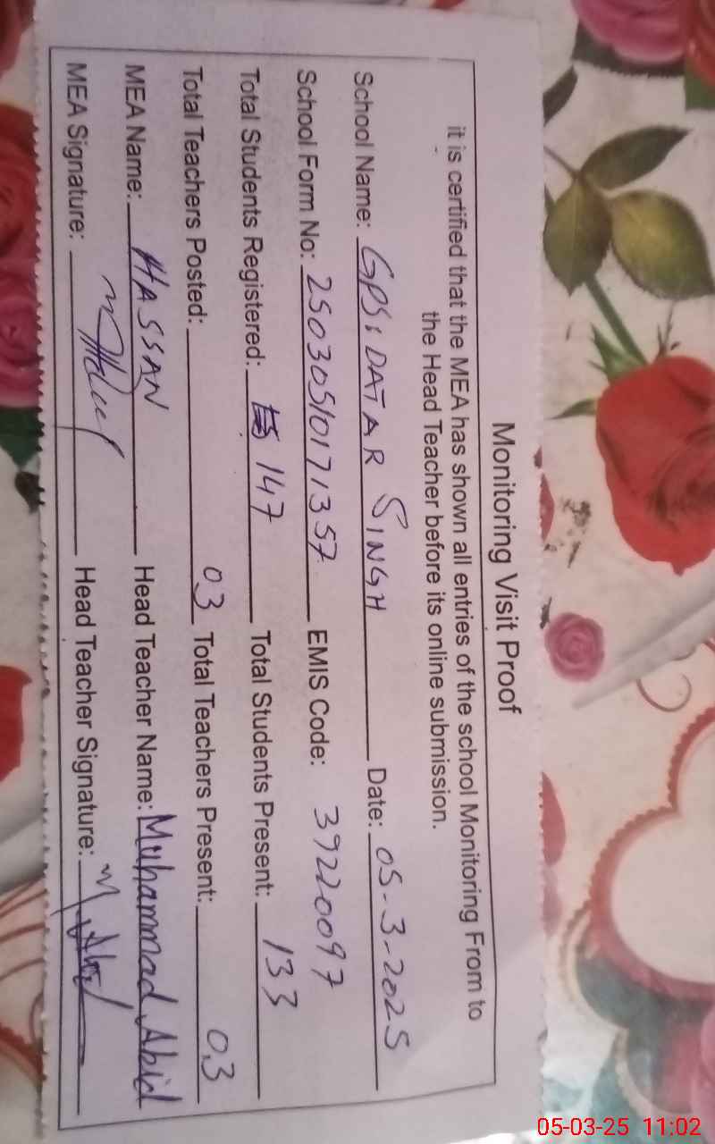| EMIS Code: 39220097 | Name of School: GPS DATAR SINGH | |||