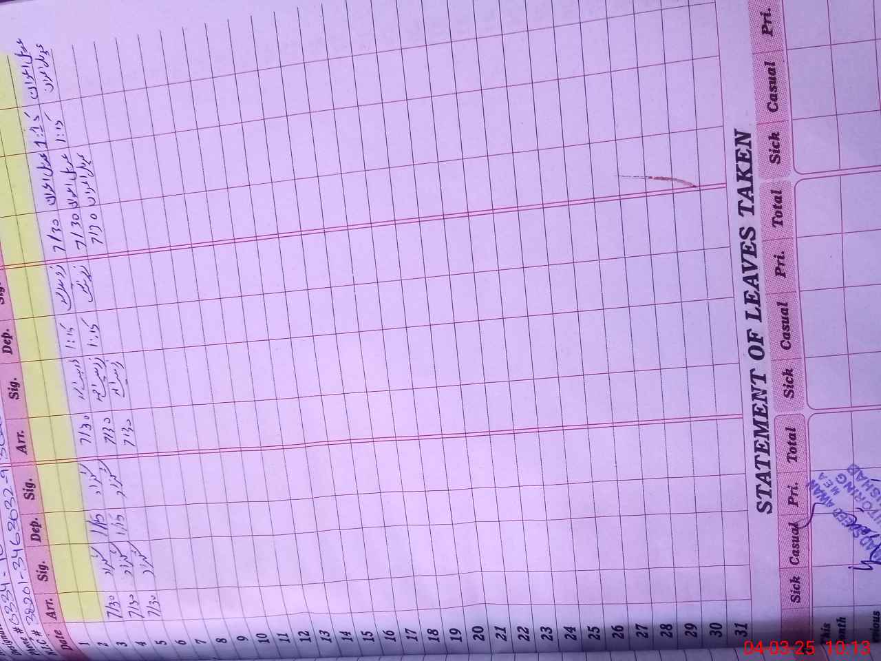 | CNIC | Full Name | Designation | R/C | Absence During Last Calender Month |