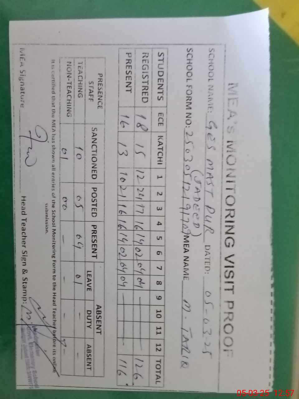| Attendance Register | Head Teacher | MEA with School | Visit Proof |