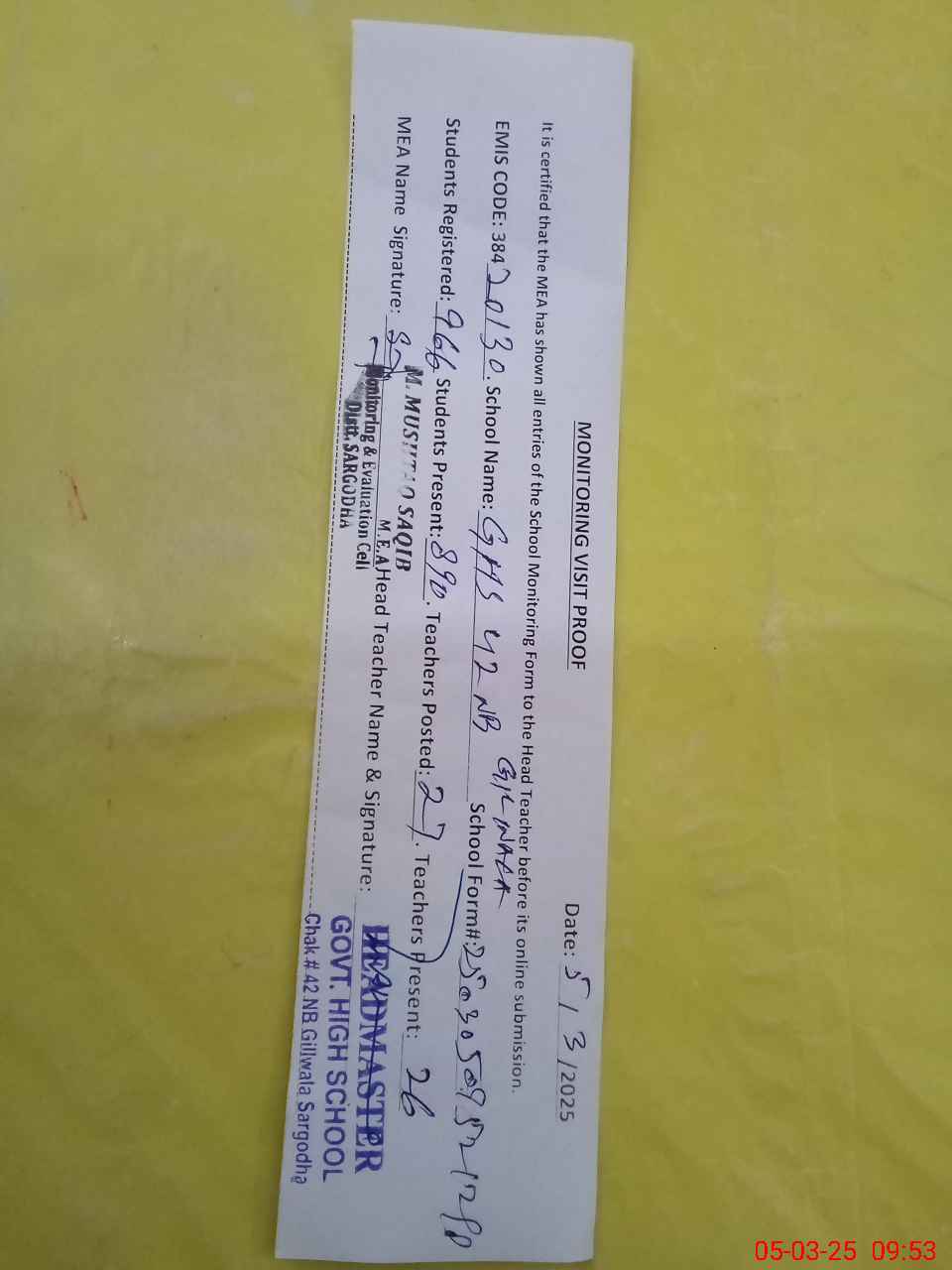 | EMIS Code: 38420130 | Name of School: GHS CHAK NO.42 NB GILL WALA | |||
