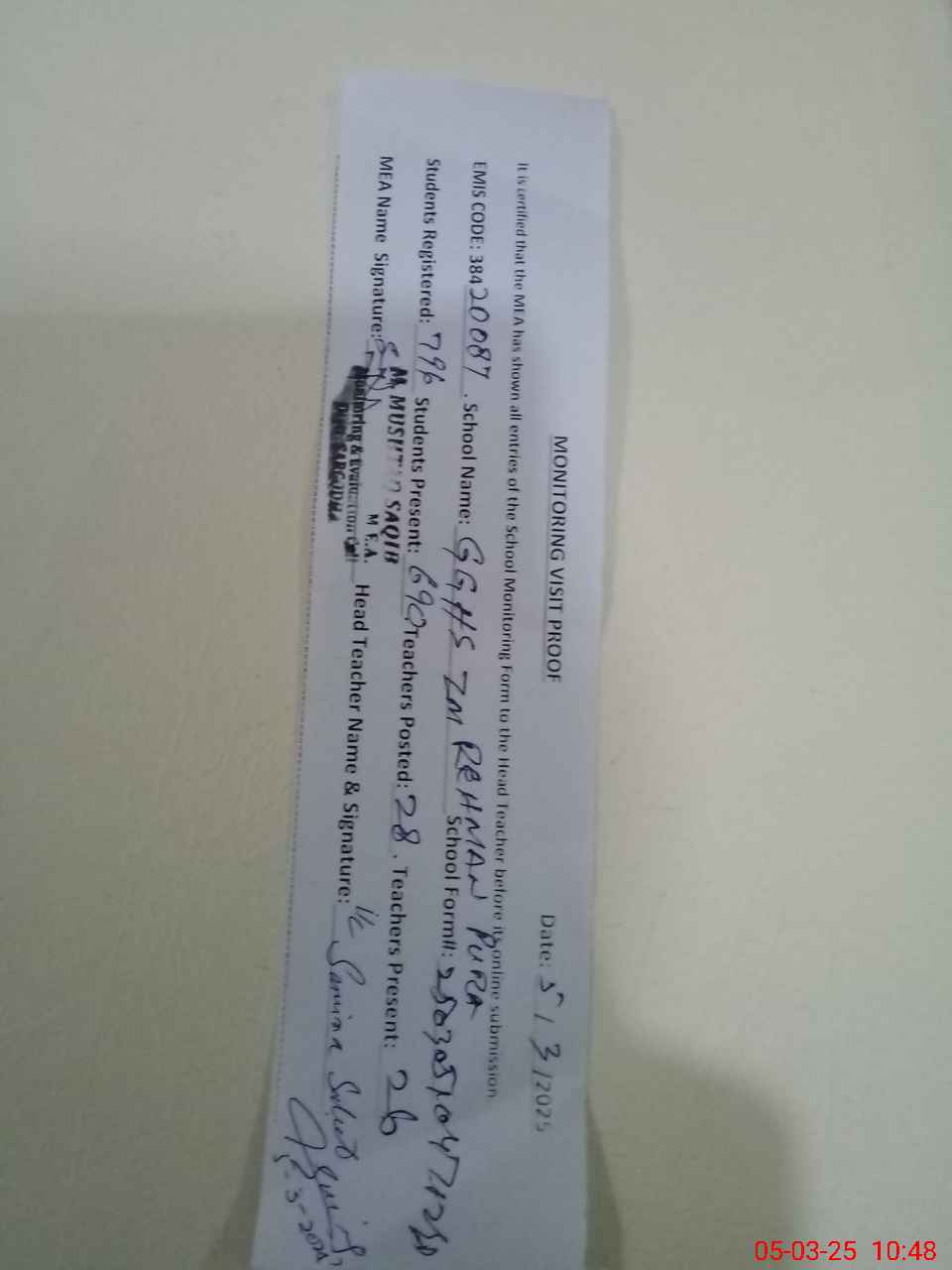 | Attendance Register | Head Teacher | MEA with School | Visit Proof |