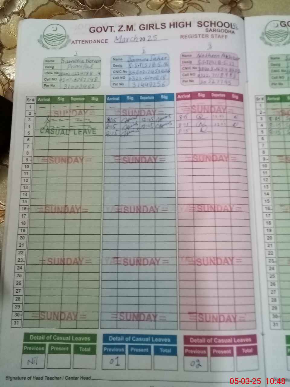| CNIC | Full Name | Designation | R/C | Absence During Last Calender Month |