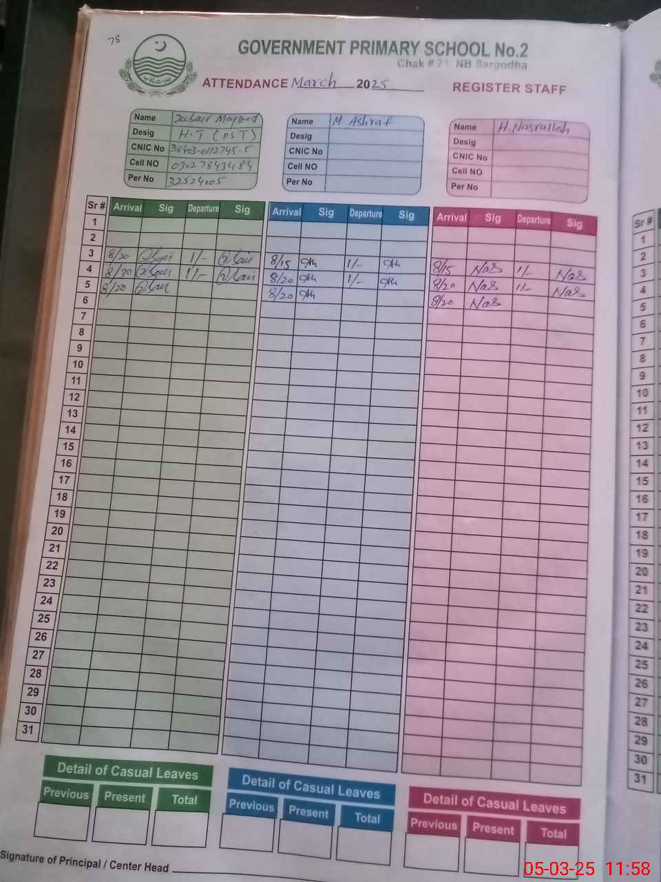 | CNIC | Full Name | Designation | R/C | Absence during last cal. month |