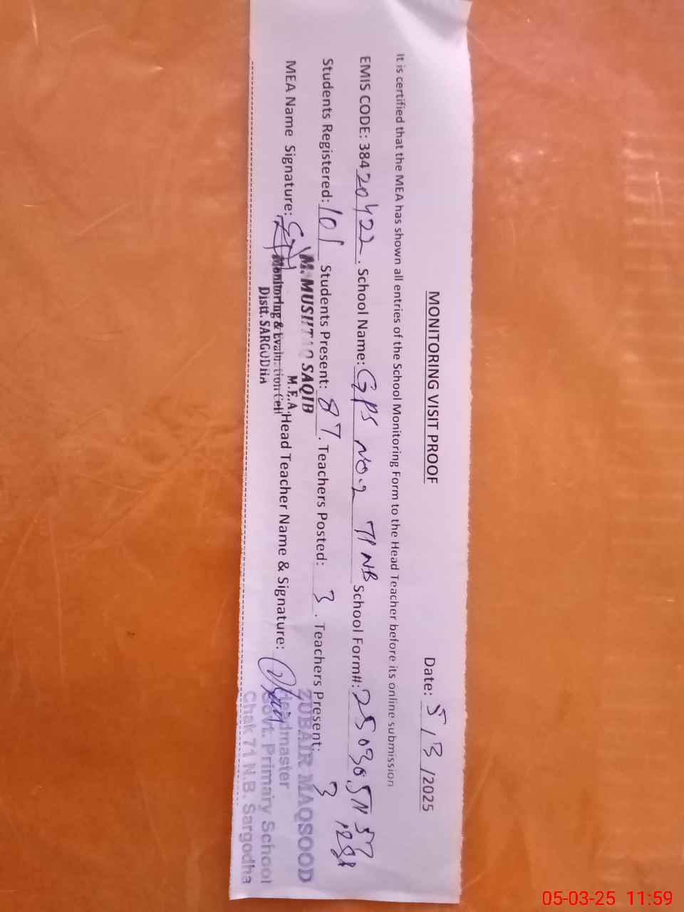 | Attendance Register | Head Teacher | MEA with School | Visit Proof |