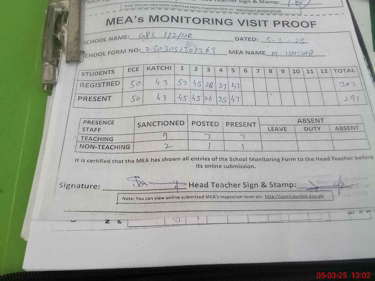 | Attendance Register | Head Teacher | MEA with School | Visit Proof |