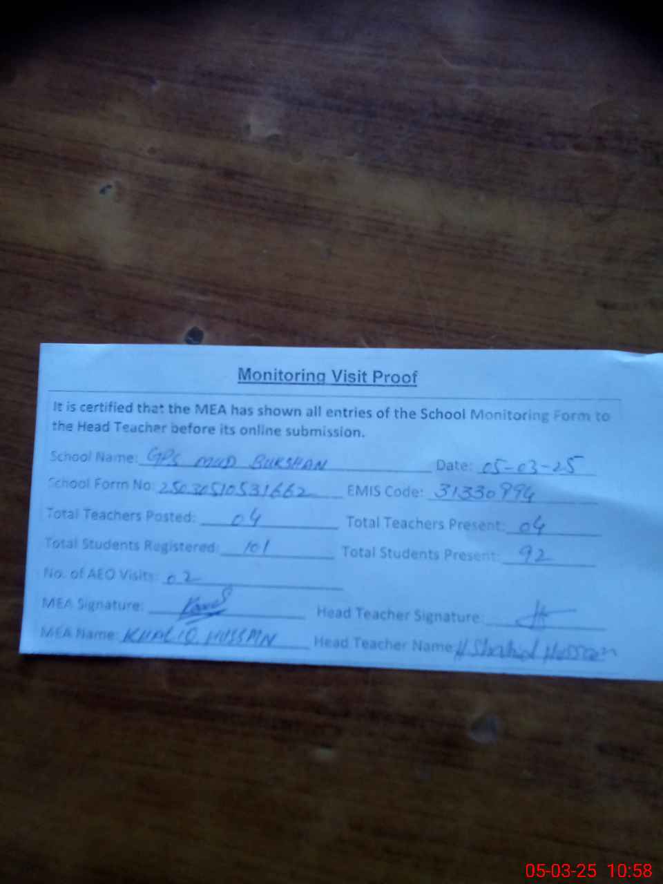 | EMIS Code: 31330994 | Name of School: GPS MUD BUKHSHAN | |||