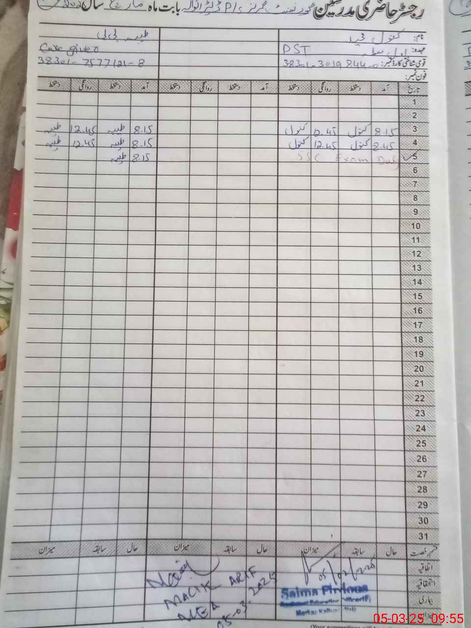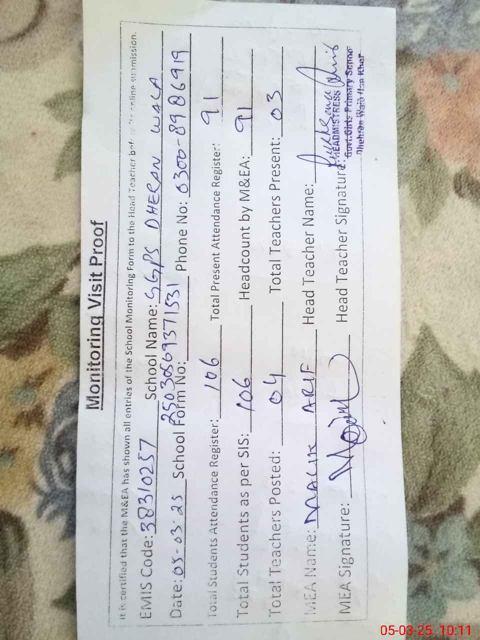 | Name: Ka**** Ma**** Designation: (School Headmaster's/Headmistress's) PST Phone/Cell Number: 03**** |