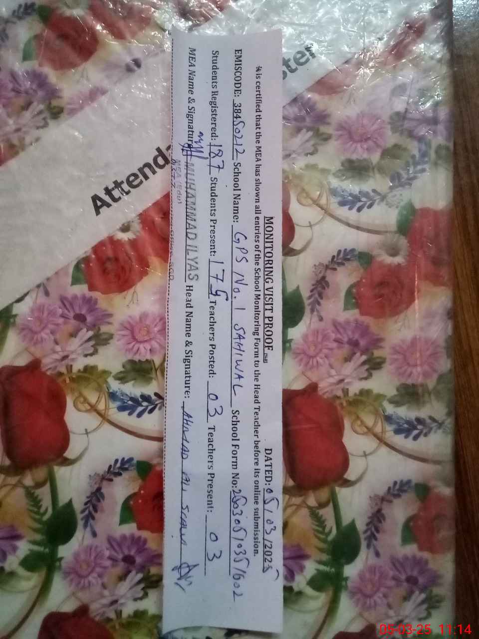 | Attendance Register | Head Teacher | MEA with School | Visit Proof |