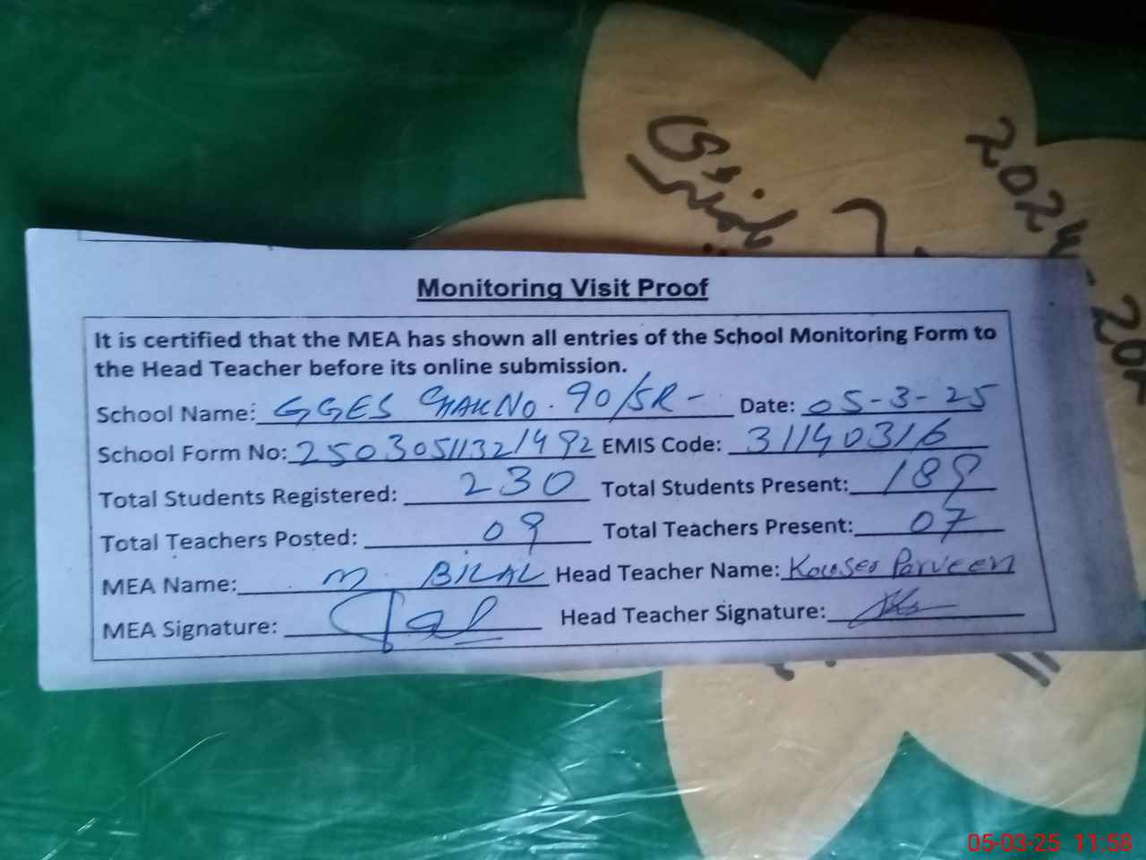 | Attendance Register | Head Teacher | MEA with School | Visit Proof |