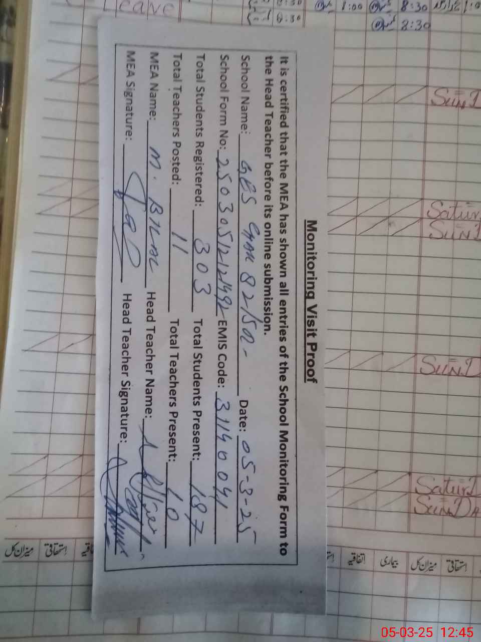 | Attendance Register | Head Teacher | MEA with School | Visit Proof |