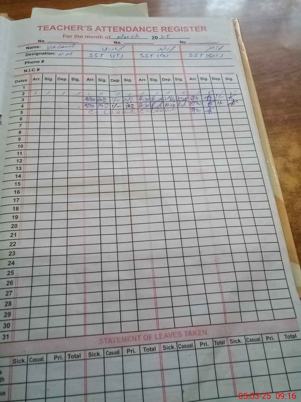 | Remarks (Use Separate Page if Required): No sanctioned leave is shown against the absent teacher name M Rasheed Therefore marked absent | |||||