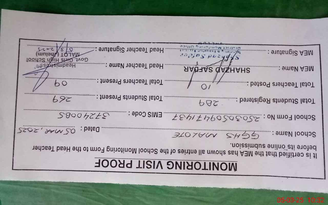 | Attendance Register | Head Teacher | MEA with School | Visit Proof |